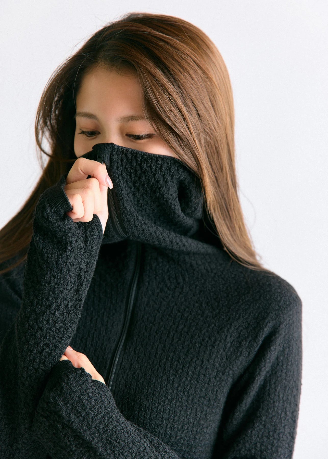 顔まで覆うバラクラバスタイルのフードを備えているので、首周りの防寒性も高く、特徴的な凸凹した表面感は、体温を衣類の中にしっかりとキープします。また縫い目がないので素肌に着てもゴロつきにくく、素肌の上に着た時に最高の機能を発揮します。