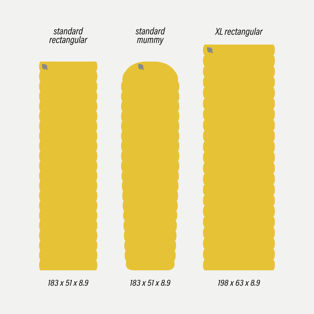 - 重量 Standard Mummy: 600g, Standard Rectangular: 650g, XL Rectangular: 885g
