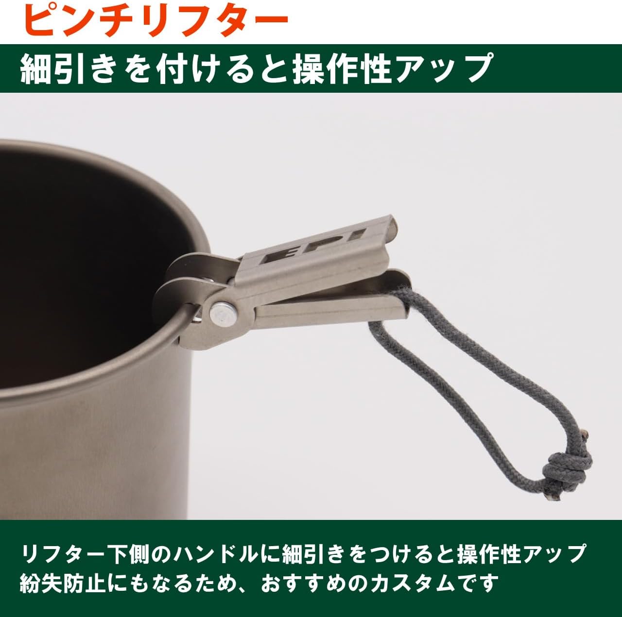 持ち手にEPIの文字が切り抜かれた、超軽量・極小サイズのチタン製ポットリフターです。